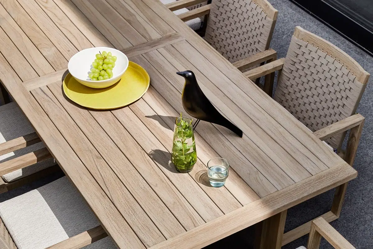 Drewno teakowe to klasyka mebli ogrodowych. Naturalne oleje i krzemionka sprawiają, że dobrze znosi deszcz i mróz. W polskim klimacie może pozostać na zewnątrz, ale znacznie lepiej czuje się pod zadaszeniem lub w altanie. Jeśli pozwalają Państwo drewnu na naturalne, równomierne szarzenie, wiosną wystarczy delikatne odświeżenie. Jeśli natomiast priorytetem jest utrzymanie ciepłego koloru – regularna pielęgnacja olejem do drewna tekowego będzie niezbędna.