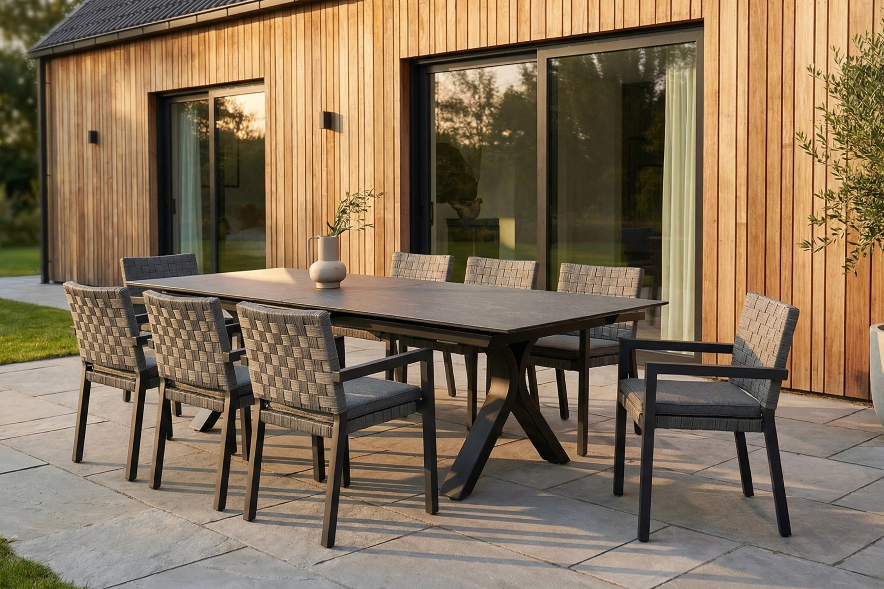 Forma stołu jest nowoczesna, ale nieprzerysowana. Proste linie i ciemnoszary kolor tworzą spokojne tło dla całego zestawu stołowego. To rozwiązanie, które dobrze odnajduje się zarówno w nowoczesnej aranżacji ogrodu, jak i na bardziej klasycznym tarasie.