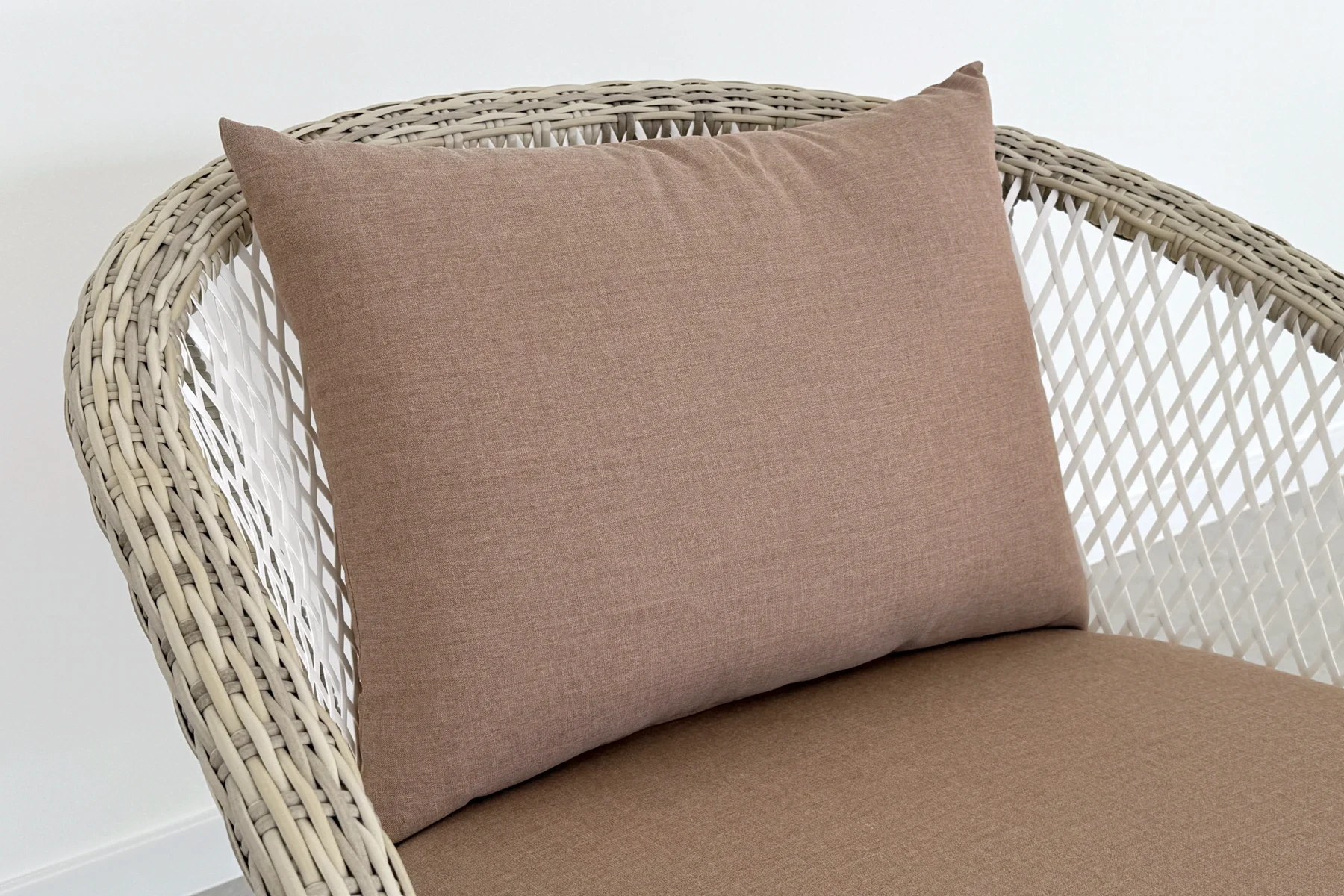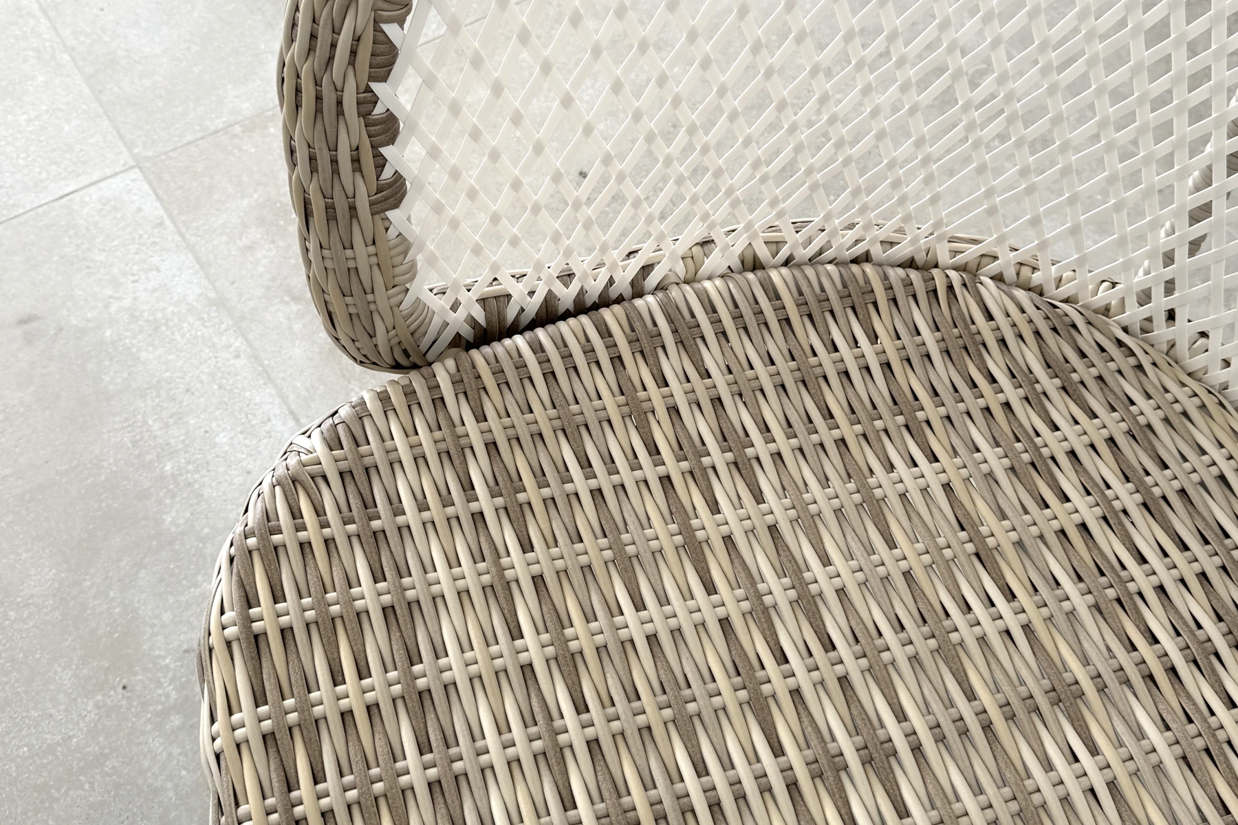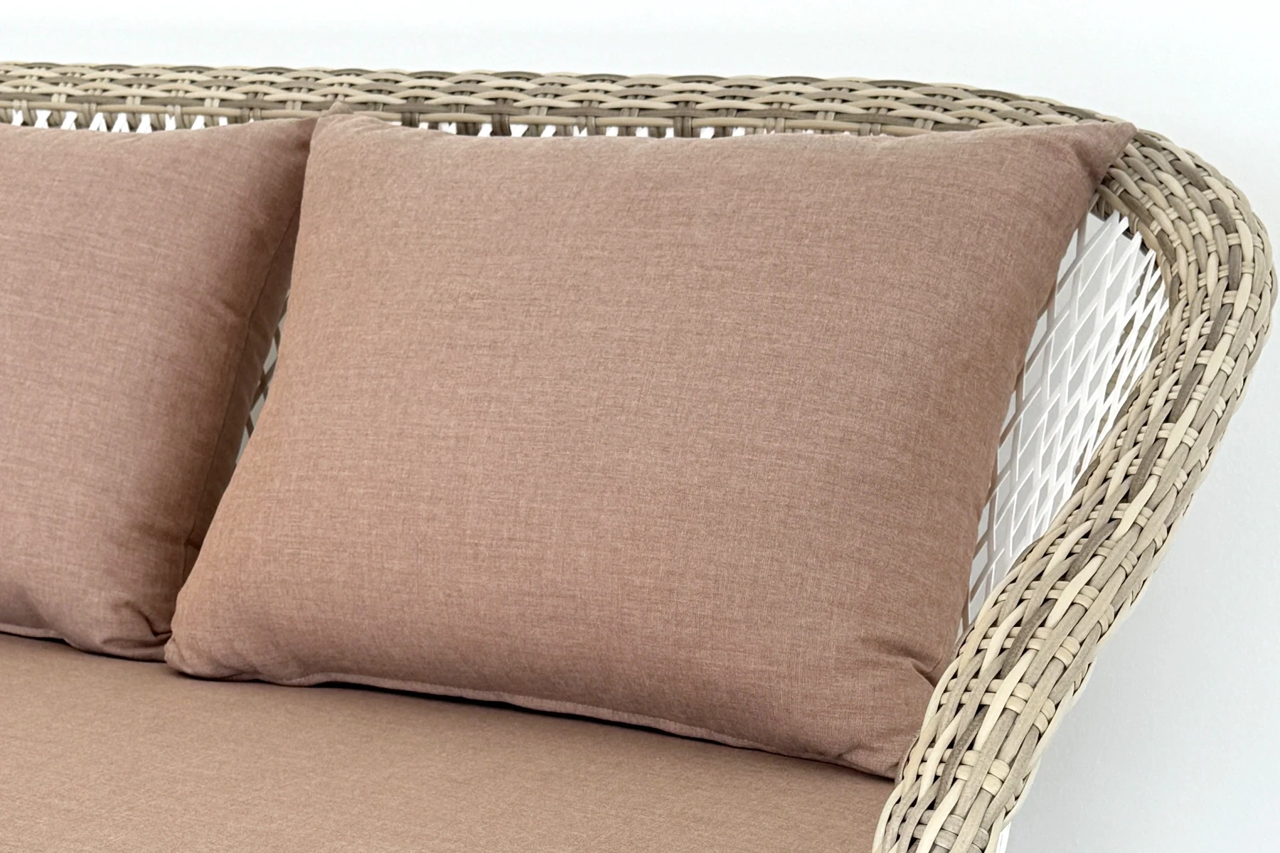 Plecionka zestawu ogrodowego Napoli nie jest jednolita — łączy odcienie bieli, beżu i brązu. To półokrągły i płaski technorattan w kilku odcieniach, który nadaje meblom wyraźną strukturę i głębię. Widać to szczególnie na podłokietnikach i frontach siedzisk. Światło inaczej układa się na poszczególnych elementach, podkreślając detal i sposób wykończenia. Zaokrąglone podłokietniki i miękko poprowadzone linie oparć porządkują kompozycję i nadają jej spokojny rytm. Forma pozostaje dekoracyjna i lekka.