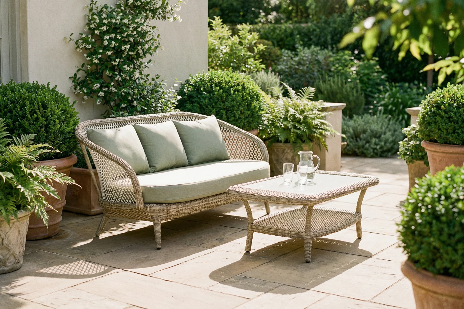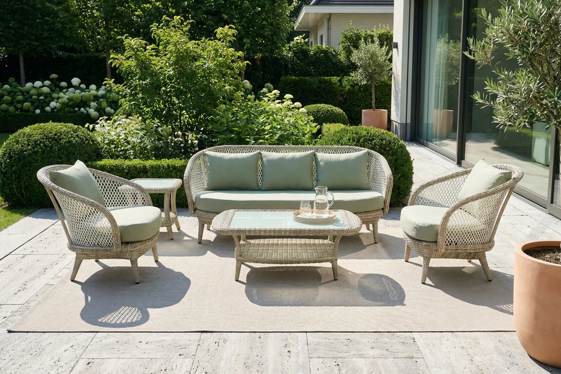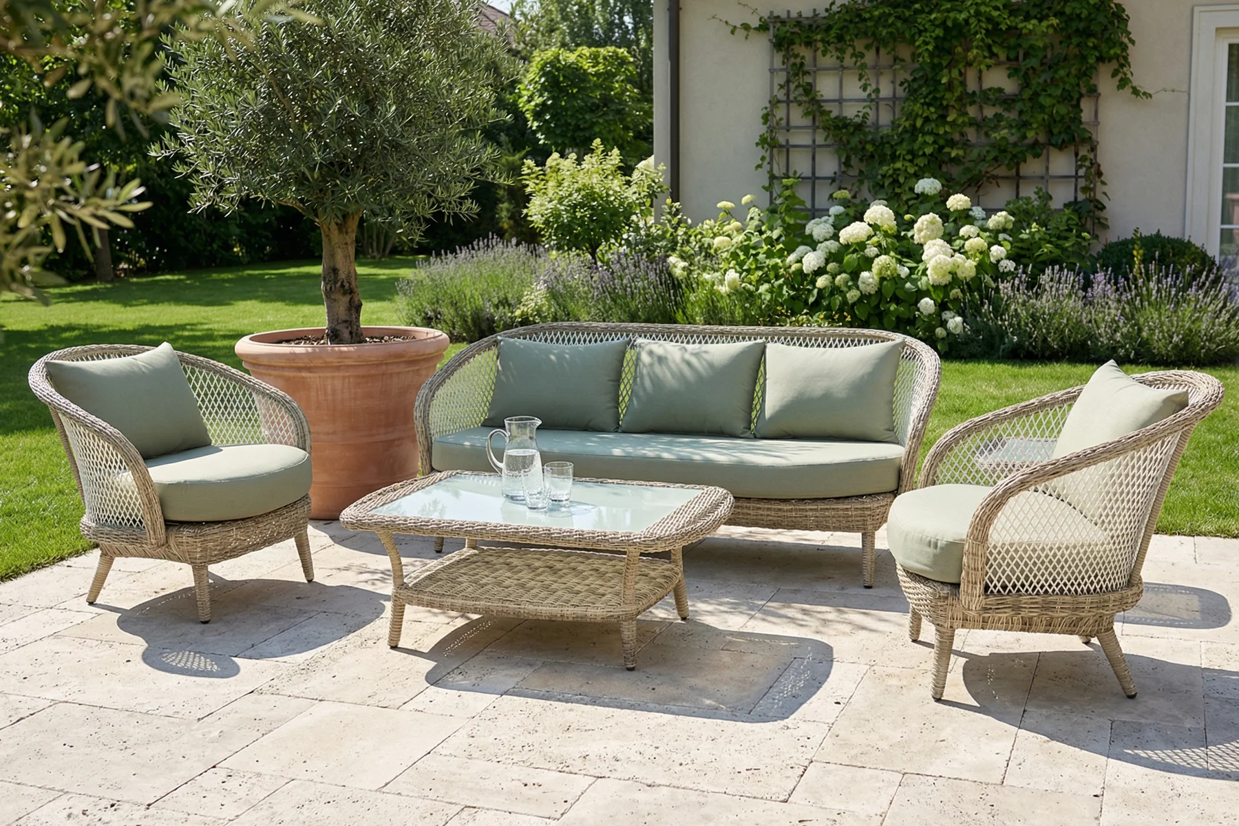 Zestaw Napoli dobrze wpisuje się w spokojne, dopracowane aranżacje, w których liczy się forma i elegancki detal. Klasyczna linia i dekoracyjna plecionka dobrze komponują się z zielenią ogrodu, jasnymi nawierzchniami i naturalnymi materiałami. Trzy kolory tapicerki pozwalają dopasować jego styl do charakteru miejsca — od bardziej stonowanych po wyraźniejsze zestawienia. To komplet, który tworzy wygodne miejsce do odpoczynku.