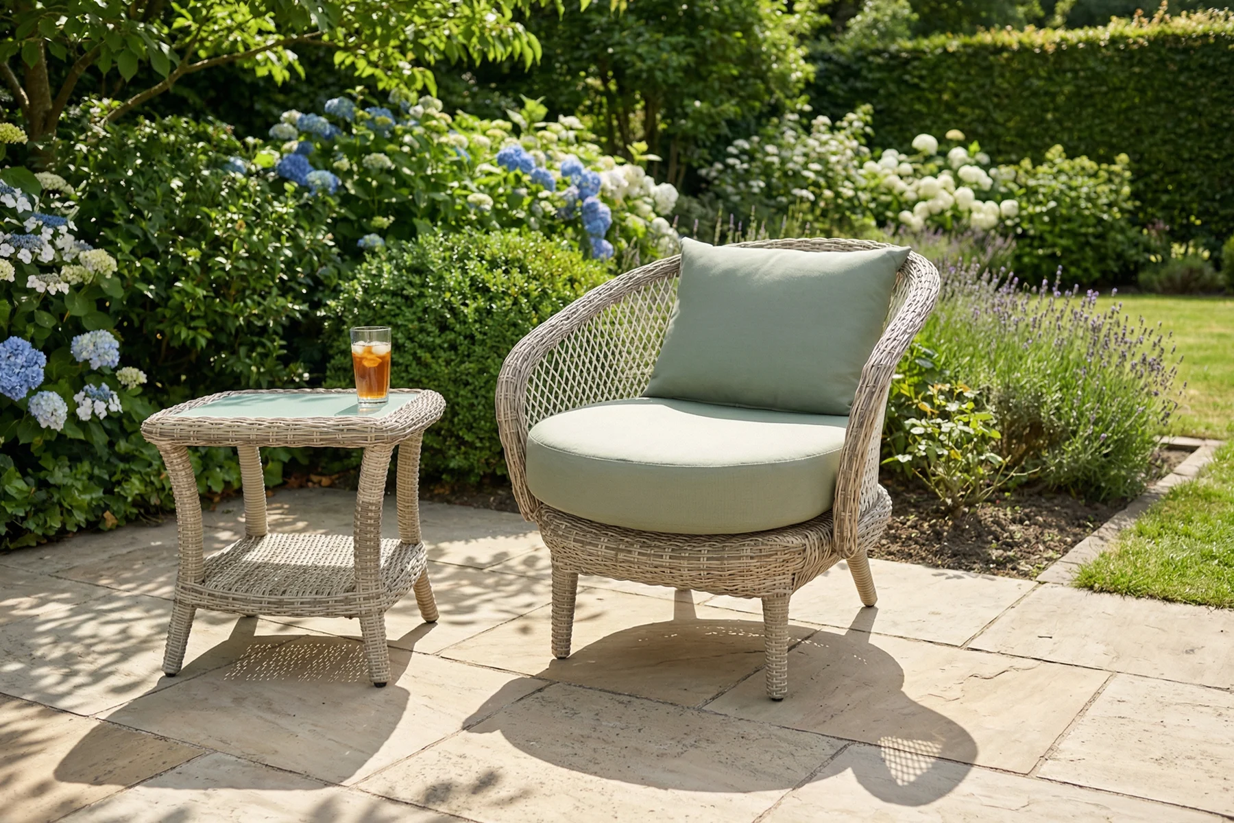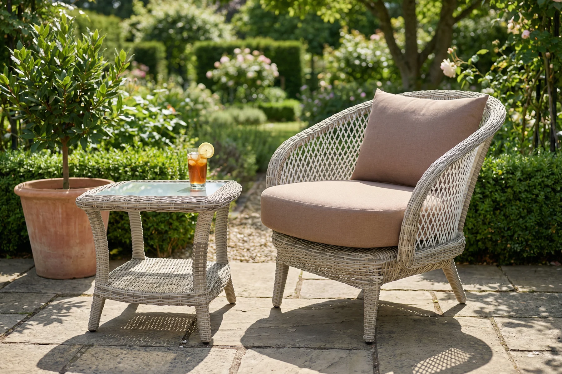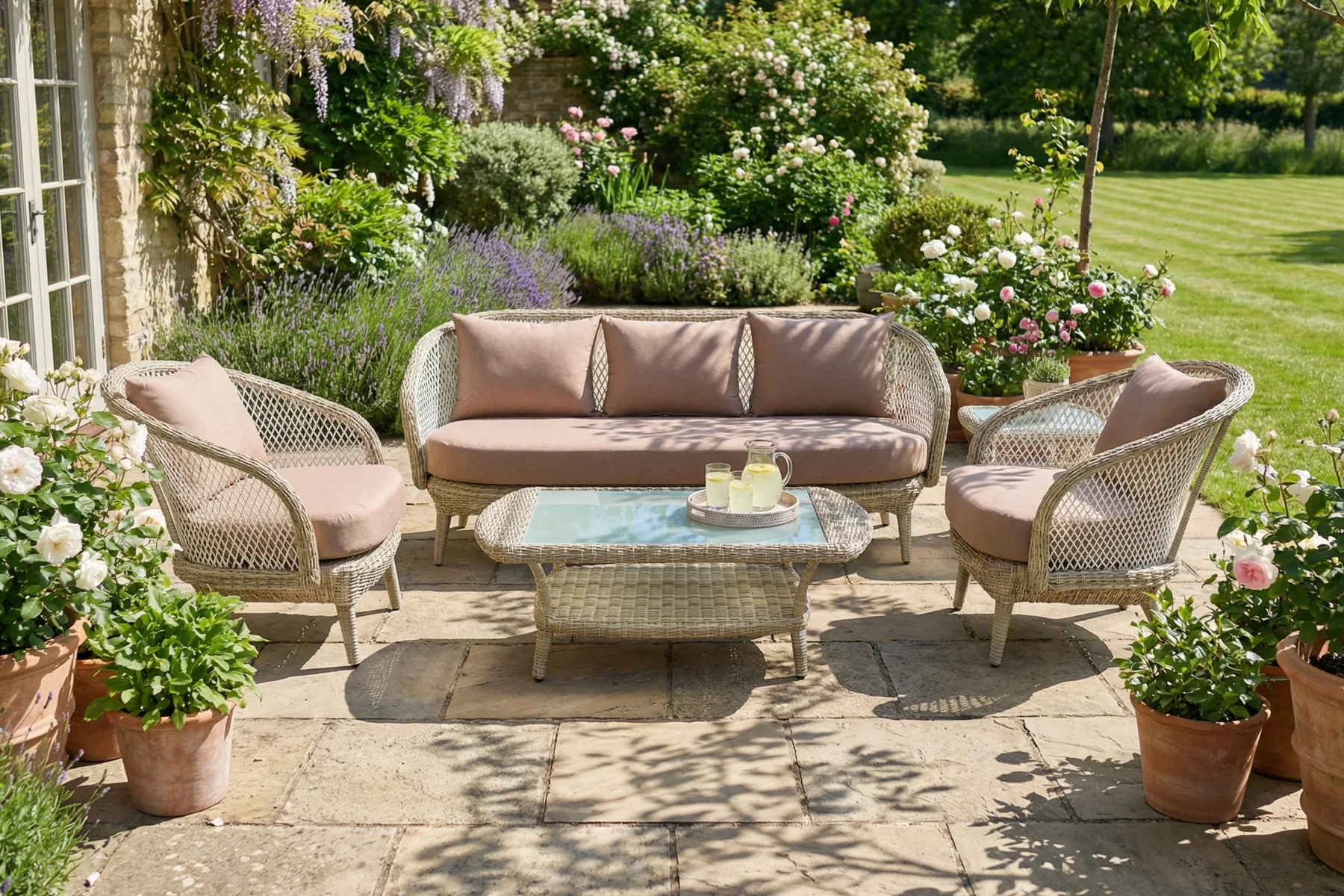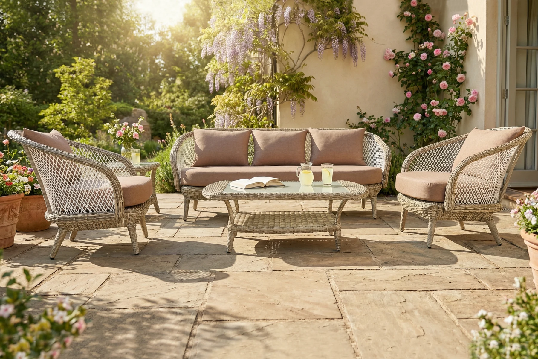 Zestaw Napoli dobrze wpisuje się w spokojne, dopracowane aranżacje, w których liczy się forma i elegancki detal. Klasyczna linia i dekoracyjna plecionka dobrze komponują się z zielenią ogrodu, jasnymi nawierzchniami i naturalnymi materiałami. Trzy kolory tapicerki pozwalają dopasować jego styl do charakteru miejsca — od bardziej stonowanych po wyraźniejsze zestawienia. To komplet, który tworzy wygodne miejsce do odpoczynku.