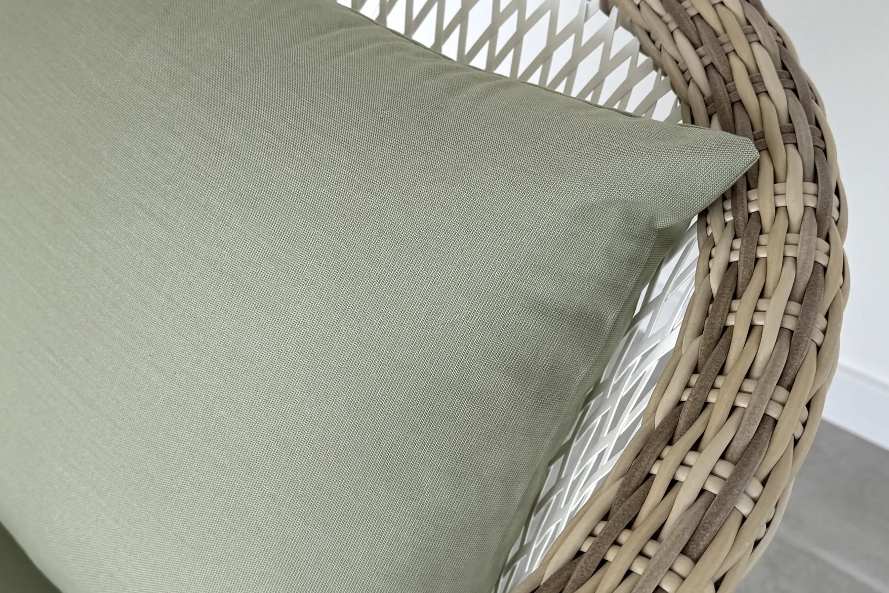 Ważnym elementem zestawu jest także tapicerka. Poduszki wypełnione gąbką tapicerską zachowują sprężystość i dobrze podpierają ciało. Tkanina akrylowa dostępna w trzech kolorach — Rose, Verte i Café au Lait — dobrze komponuje się z plecionką i jest przystosowana do użytkowania na zewnątrz, dzięki czemu zachowuje kolor i strukturę.