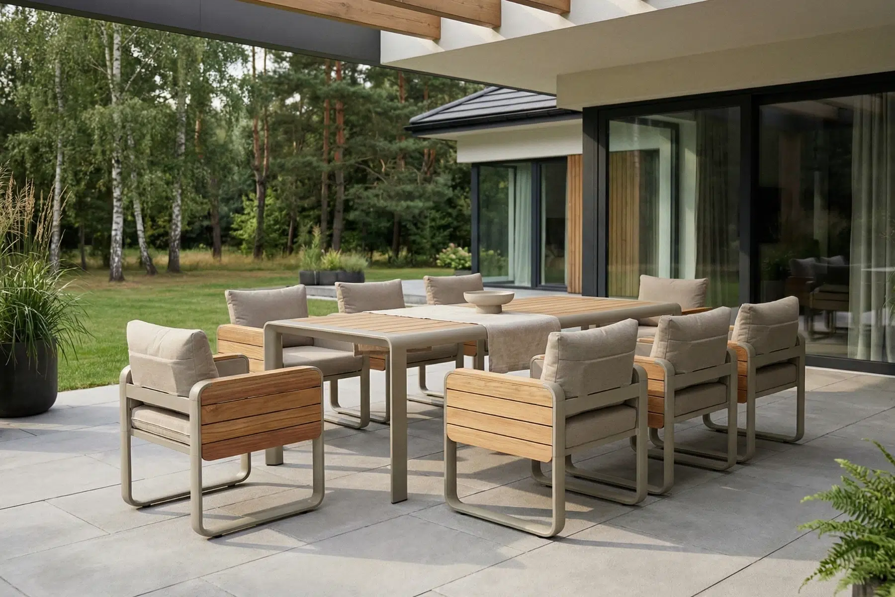Beżowe odcienie aluminium i tkanin zestawiono z naturalnym wybarwieniem drewna. Taka kompozycja dobrze współpracuje ze światłem i zielenią w ogrodzie. Nie dominuje, ale wprowadza spójność i spokojne tło dla codziennych sytuacji.