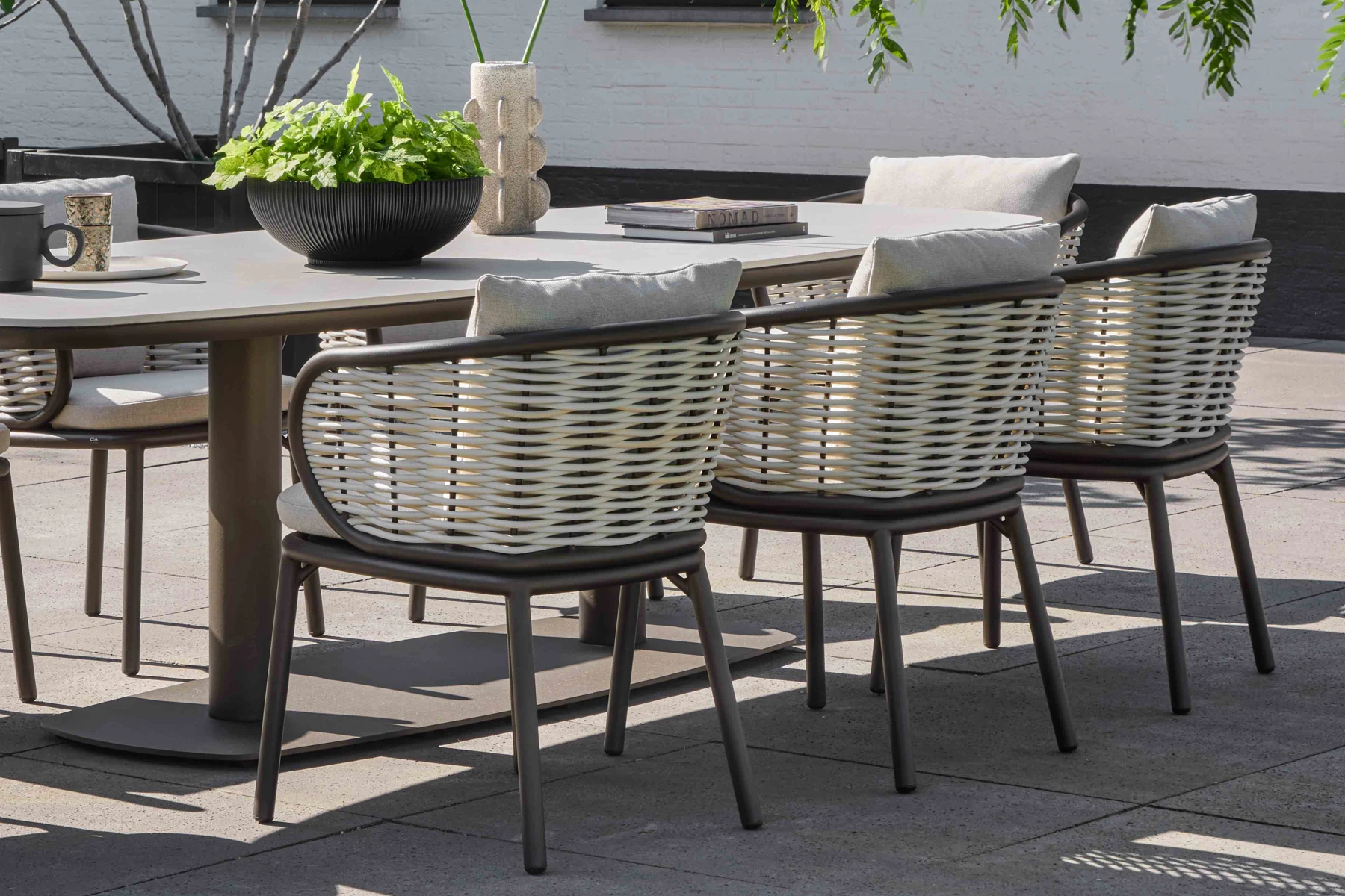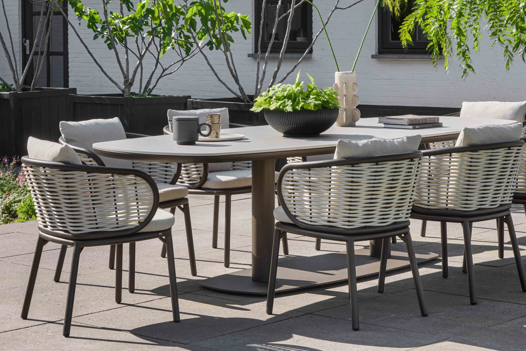 Pine Key Bronze zestaw ogrodowy stół i 8 krzeseł łączy dopracowaną linię, naturalną lekkość projektu i komfort, który sprawdza się w codziennym użytkowaniu na tarasie. Owalny stół ogrodowy ze spiekiem kamiennym i krzesła z plecionki Biculair® w odcieniu 'oyster’ tworzą harmonijną kompozycję o nowoczesnym, spokojnym charakterze.