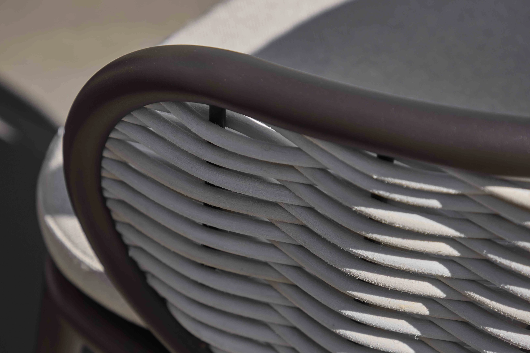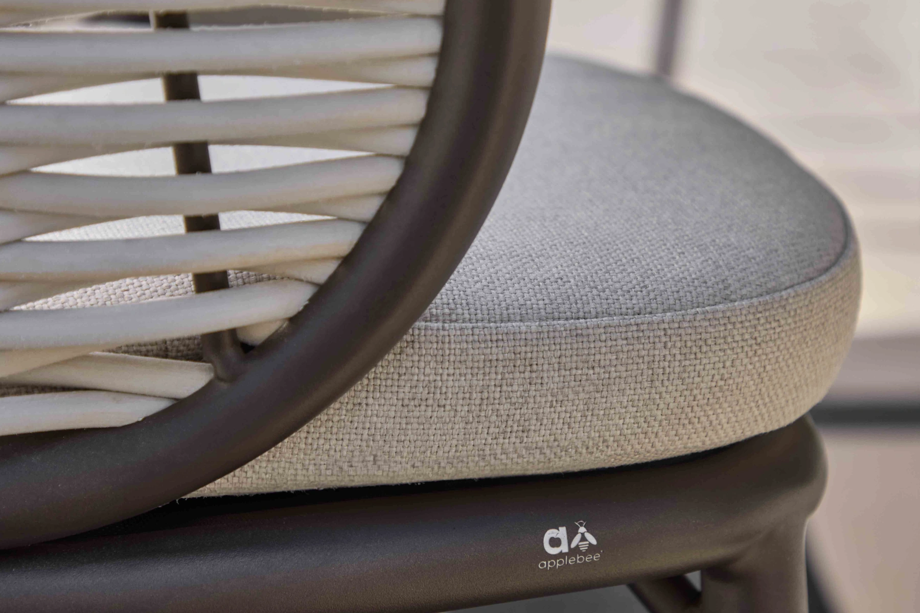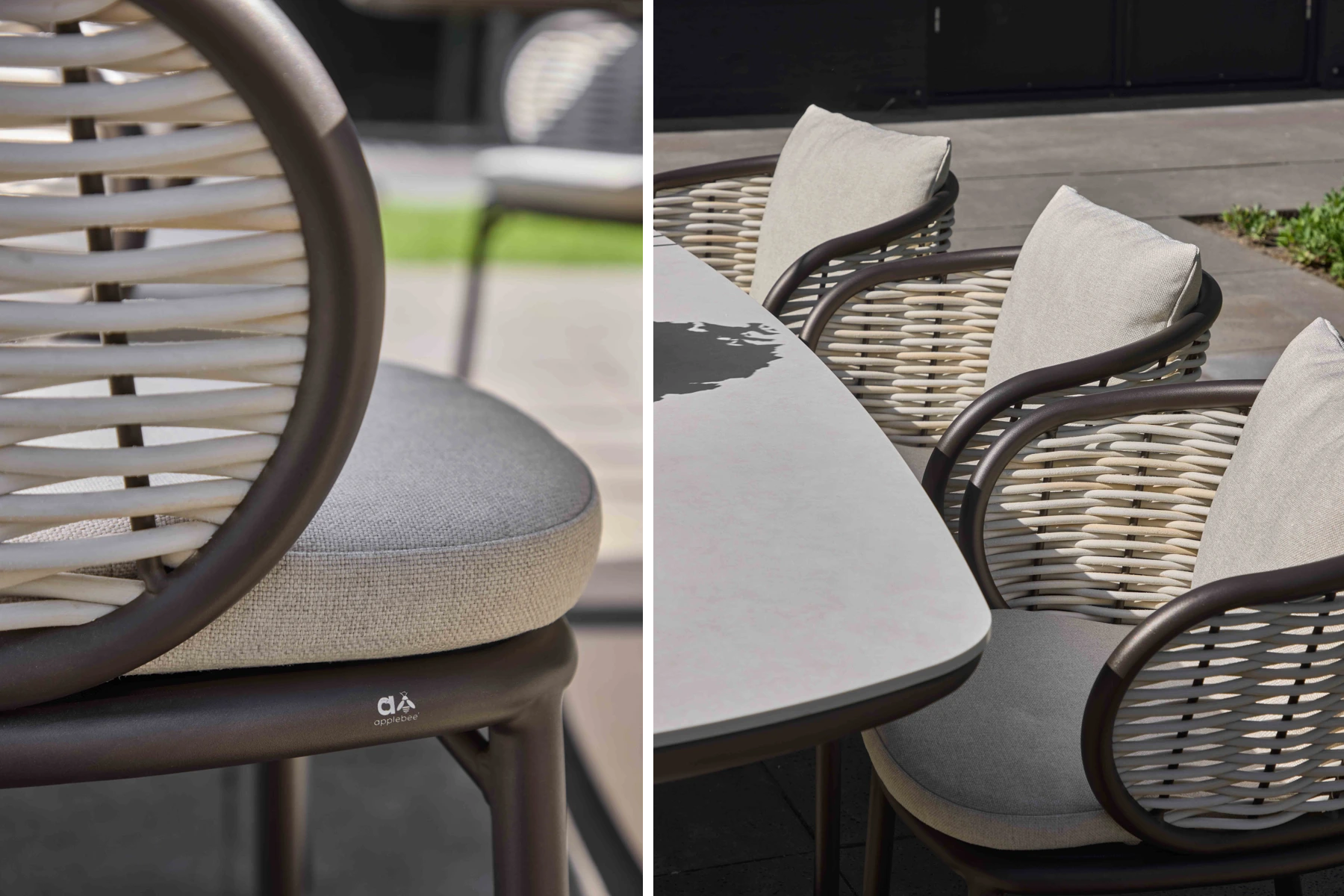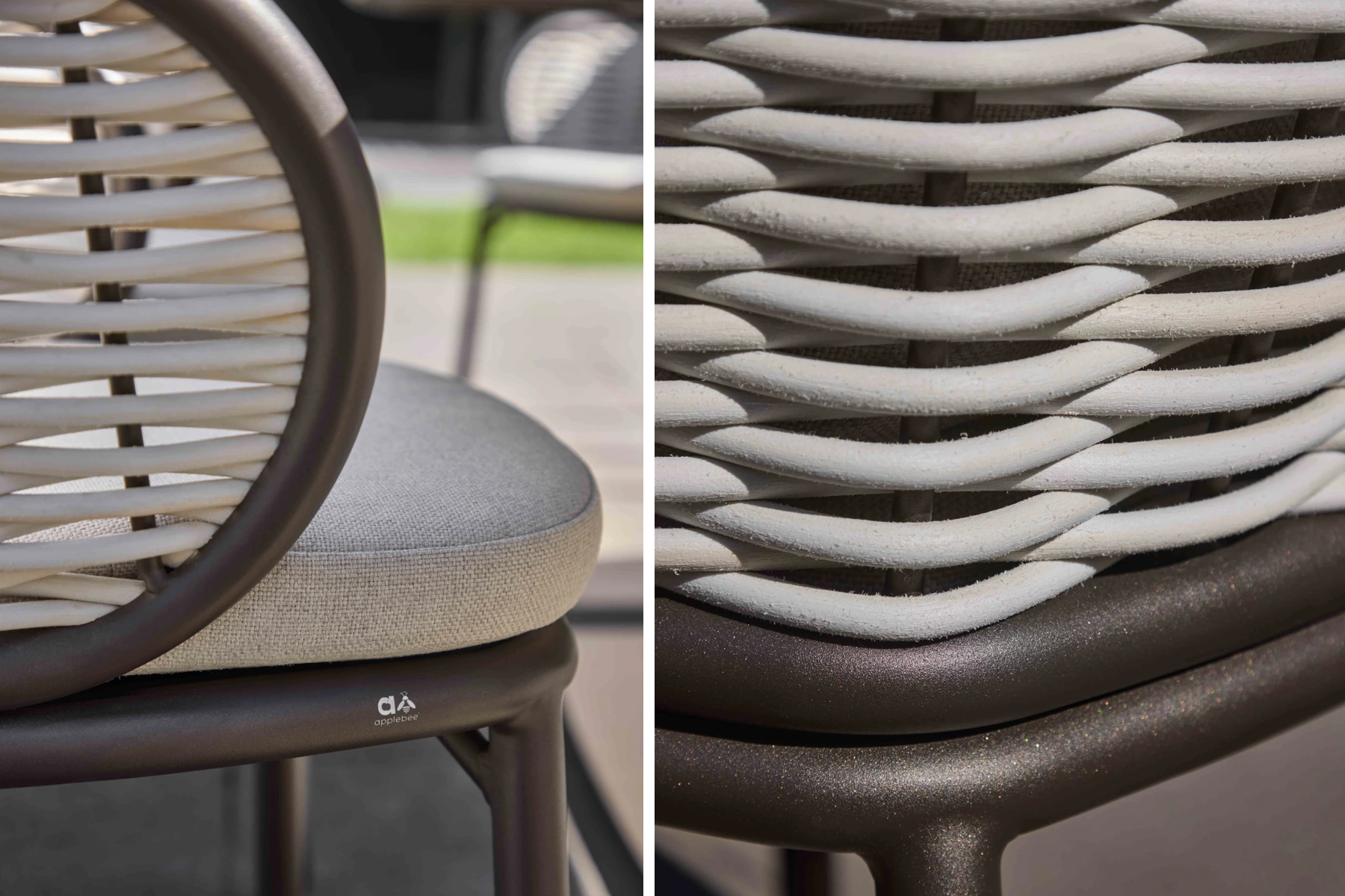 Siedziska i oparcia to poduszki i tapicerkai wykonane w technologii BEE WETT®. Wypełnienie nie chłonie wilgoci, a otwarta struktura dolnej warstwy sprawia, że woda jest szybko odprowadzana. Dzięki temu poduszki schną wyjątkowo szybko i pozostają wygodne nawet po ulewnym deszczu. Jasny beż 'Natur-CN’ nadaje siedziskom miękkości i elegancji, doskonale komponuje się z ciepłym odcieniem aluminium oraz kolorem technorattanu.