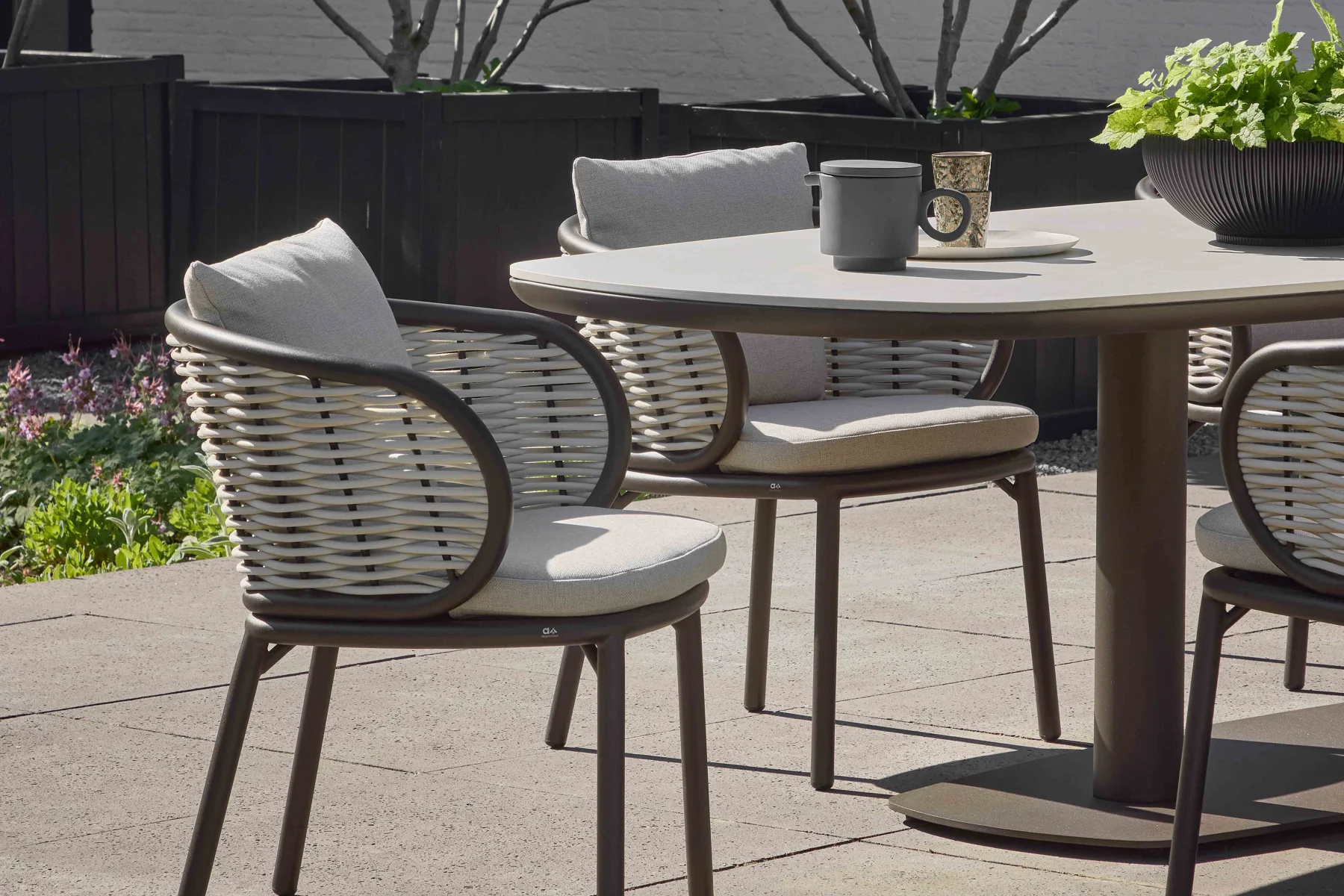 Pine Key Bronze to zestaw ogrodowy stół i 8 krzeseł, który wprowadza do aranżacji ogrodowej równowagę i subtelną elegancję. Połączenie spieku kamiennego, jasnej plecionki Biculair® i aluminium w odcieniu 'bronze’ tworzy ponadczasową kompozycję. To meble ogrodowe zaprojektowane tak, aby służyć przez wiele sezonów — wygodne, trwałe i harmonizujące z naturalnym otoczeniem.