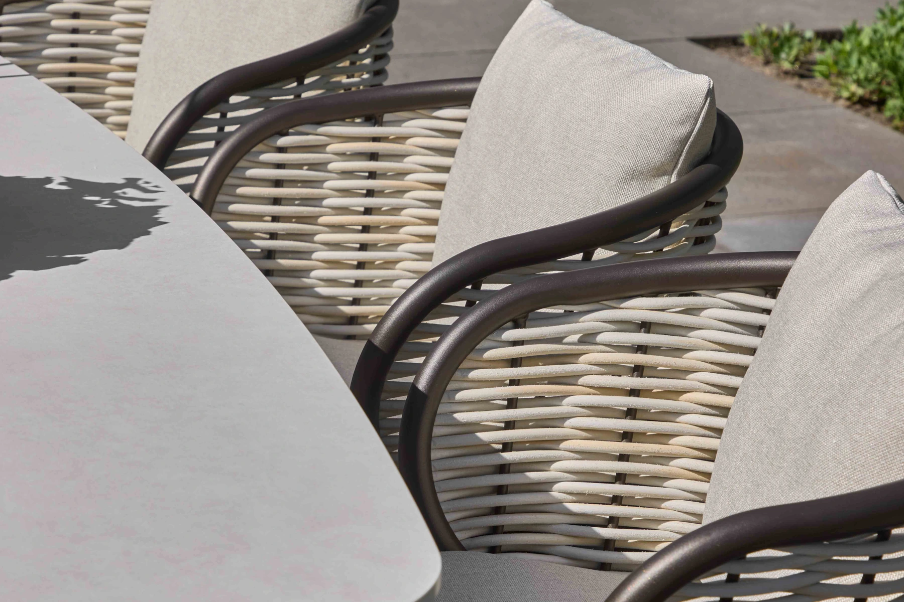 Blat wykonano ze spieku kamiennego w kolorze 'oyster’ — kremowo-szarej tonacji, która doskonale dopełnia plecionkę krzeseł. Materiał jest odporny na wilgoć, wysoką temperaturę i promieniowanie UV, a jego delikatna struktura nadaje stołowi subtelną elegancję. To rozwiązanie praktyczne i estetyczne, idealne do codziennych aranżacji zewnętrznych.