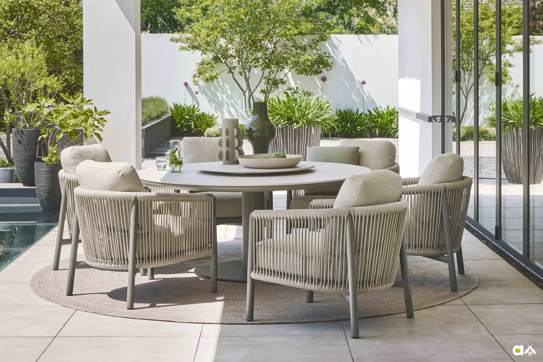 Kolekcja Bora Bora Taupe w wersji low dining opiera się na niskim stole i wygodnych fotelach, które pozwalają siedzieć swobodniej, bliżej siebie. Okrągły blat ułatwia kontakt i sprzyja spokojnym spotkaniom na tarasie. Kolorystyka taupe oraz naturalne wykończenia dobrze wpisują się w otoczenie zieleni.