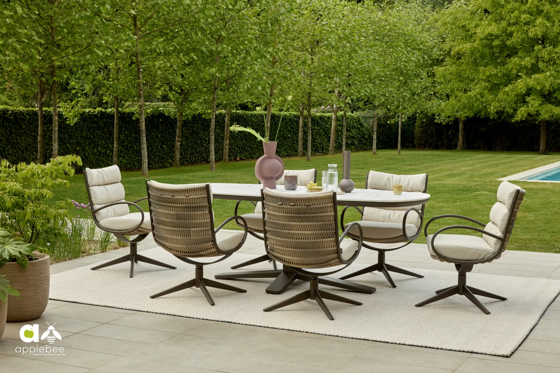 Obok wyraźnego podziału na motywy stylistyczne, kolekcje Apple Bee 2026 pokazują także zmianę w podejściu do sposobu korzystania z mebli ogrodowych. Granica pomiędzy strefą wypoczynkową a jadalnianą staje się coraz mniej wyraźna. Coraz większe znaczenie ma wygoda, swoboda i możliwość spędzania dłuższego czasu przy stole, bez sztywnego podziału funkcji.