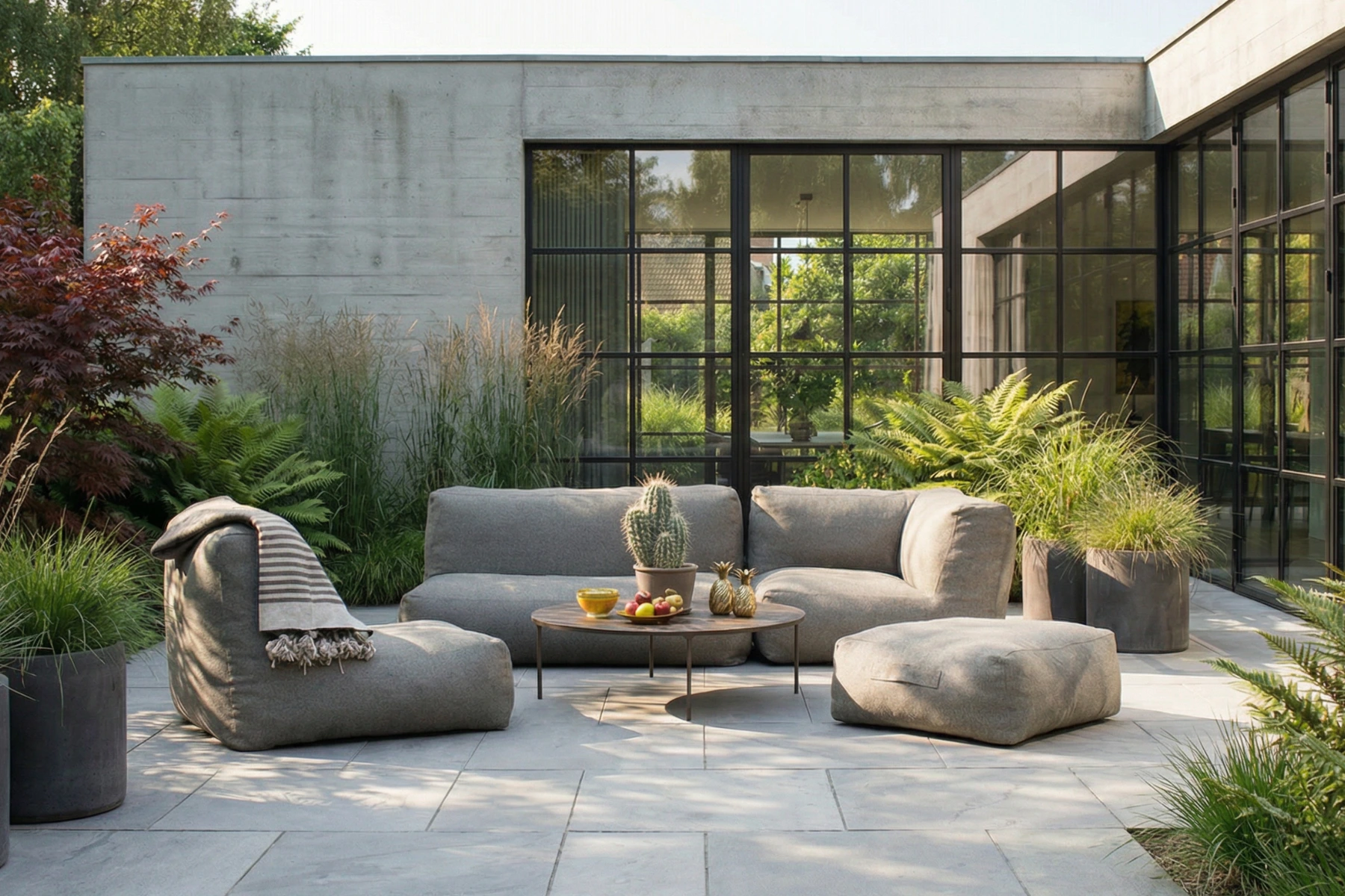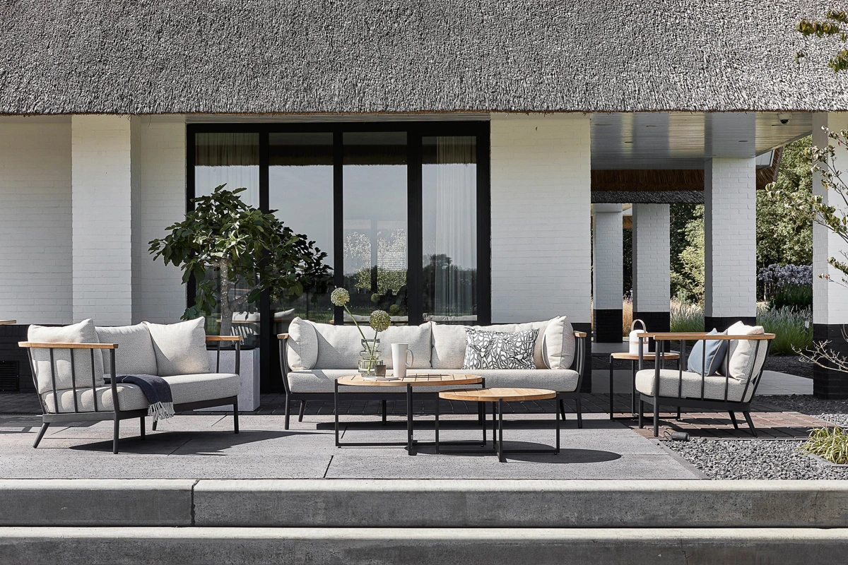Planując aranżację tarasu przy domu, warto zadbać o swobodę poruszania się oraz o to, aby meble nie ograniczały widoku na ogród z wnętrza domu.